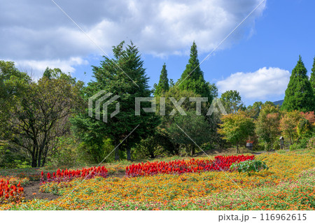 大分縣竹田市秋季花卉種植園「九重花卉公園」中,雞冠花和百日菊盛開