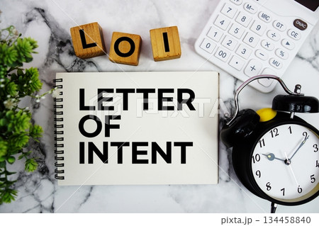 LOI Letter of Intent text with calculator and alarm clock on marble background