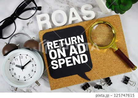 ROAS Return On Ad Spend acronym with alarm clock and magnifying glass, business concept background
