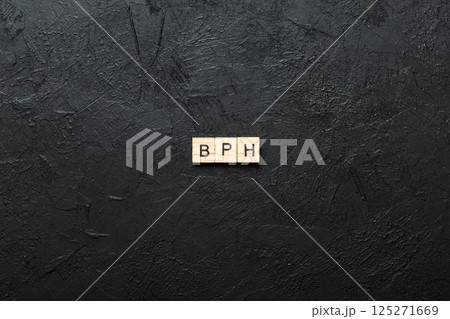 BPH - Benign Prostatic Hyperplasia symbol. Medical and BPH concept. BPH word is made up of wooden cubes on a black background in a concept with business accessories