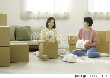 母女把餐具裝進紙箱準備搬家