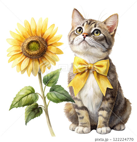 Cat Sunflower Bow Minimal Clipart Watercolor