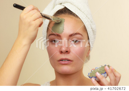 Woman applying with brush clay mud mask