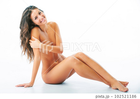 Portrait, smile and nude woman on studio floor for body care, wellness and cosmetics on white background. Naked, beauty and face of female model relax after luxury pamper, skincare and skin treatment