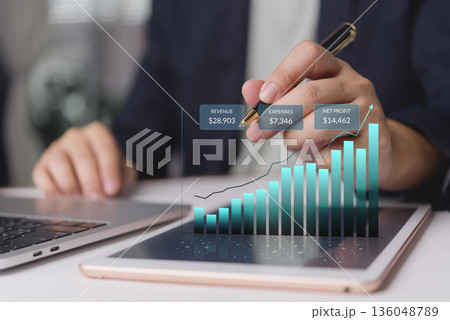 Business analyst reviews revenue expenses profit on tablet in office for financial report forecast strategy growth trend KPI data analytics dashboard investment performance ROI budgeting