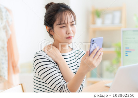 一位年輕的亞洲女性晚上在臥室裡肩膀僵硬