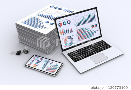 筆記型電腦、智慧型手機、一堆商業文件、業務策略建構和數據分析的圖像