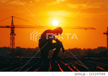 Construction worker silhouette against sunset sky with cranes on city skyline background