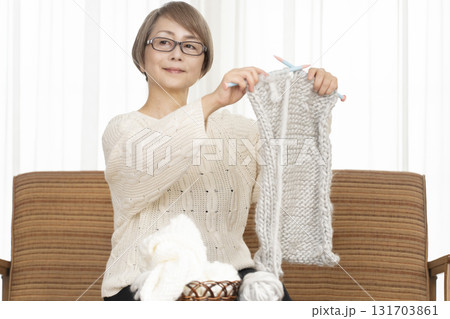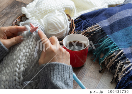 婦女的手編織毛線球和圍巾