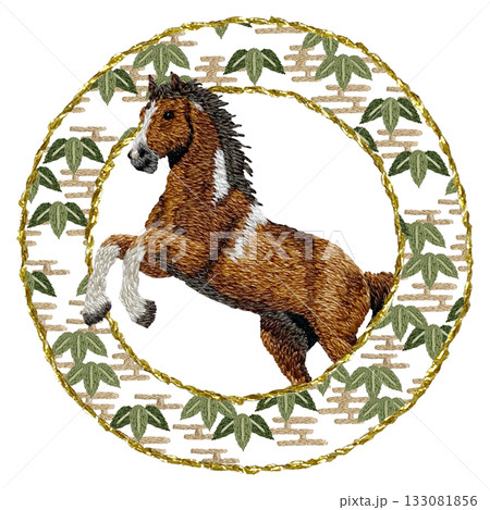 【金色圓形馬竹圖案】手工刺繡插畫素材