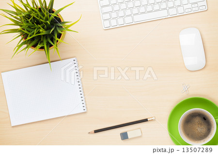 Office table with notepad, computer, coffee cup and flower