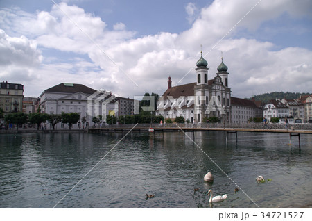 View of Jesuit church and the Reuss river in Lucerne, Switzerland