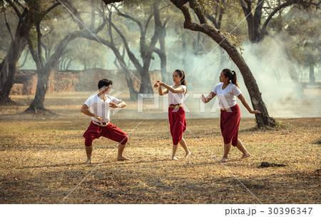 Beautiful Asian woman wear Thai traditional dress action of dancing together with man stand