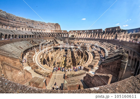 WIde angle view inside the ancient Colosseum, popular tourist destination in Rome