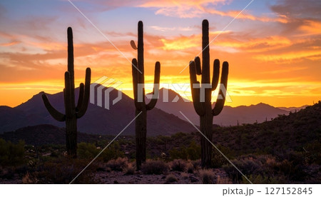 Desert saguaro cactus silhouettes against a sunset in Arizona, a classic southwest landscape with arid beauty