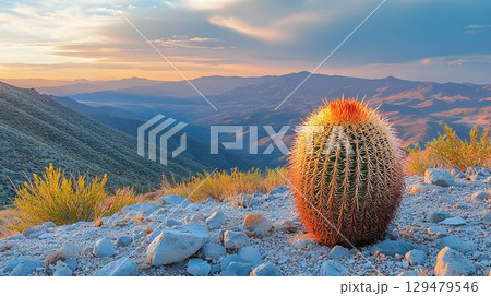 Golden Barrel Cactus at Sunrise with Mountain View in Arizona Desert