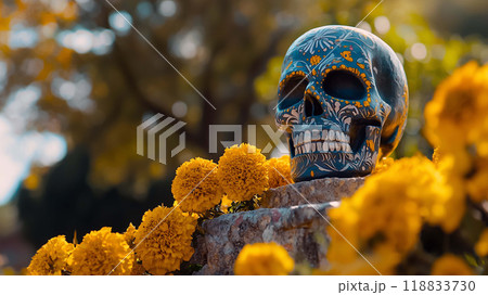 Colorful sugar skull with flowers on blue background. Concept of Dia de los Muertos, celebration, art and culture.