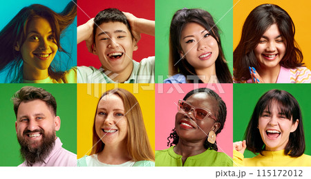 Collage of group of smiling people together symbolizing connection contacting multiracial society against vibrant studio background.
