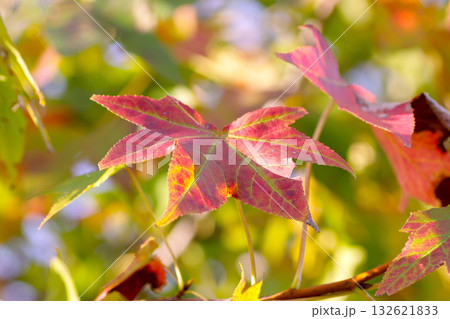 Colorful autumn foliage of the liquidambar tree with red, yellow and green leaves