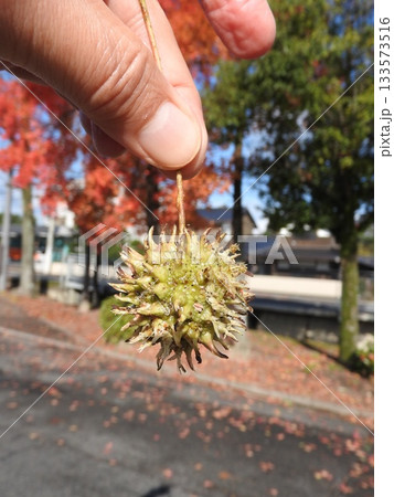 手中拿著一顆楓香果