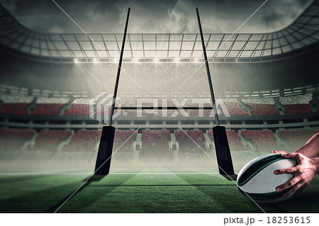 Composite image of full length of rugby player placing ball