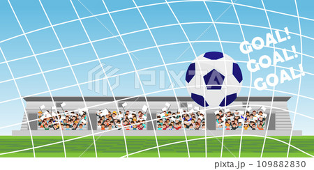 Crowd in stadium grandstand to cheering football match team.