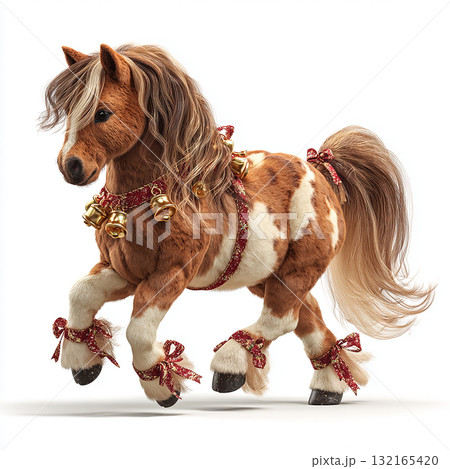 Colorful plush pony with festive decorations stands in a bright scene