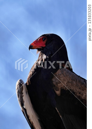 一隻雄性安地斯神鷹側躺著,喉嚨鼓了起來。