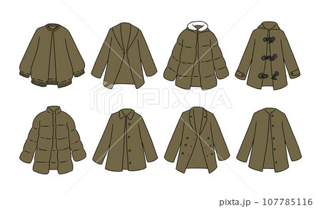 冬季服裝、長袖襯衫、夾克和外套等服裝的簡單等距線圖示(黑色和白色)