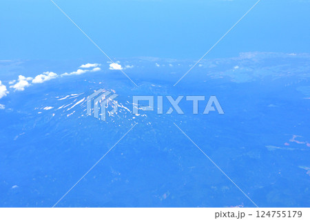 從秋田縣鳥海藍線的保立展望台眺望白雪皚皚的鳥海岳和稻倉岳。