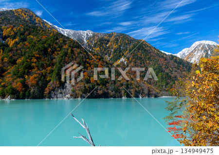 長野縣大町市平良-高瀨水壩調節湖的秋葉呈現出鮮豔的乳藍色,枯樹依然屹立,遠處是藍天下白雪皚皚的群山。