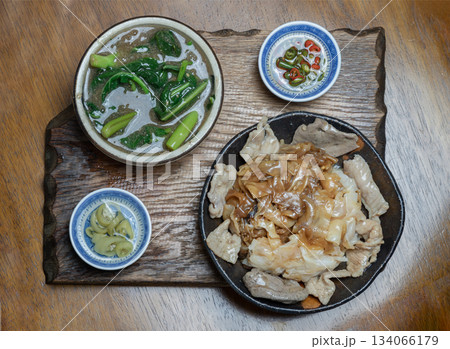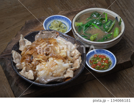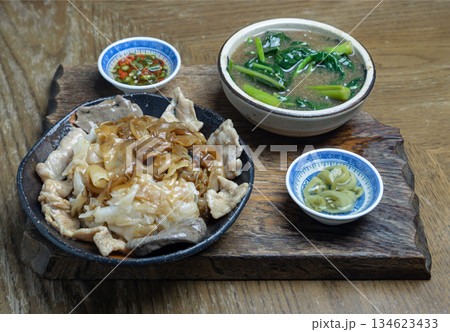 Wide rice noodles served Marinated pork and Chinese kale in a rich, thick gravy sauce.