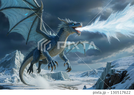 人工智慧生成的冰龍飛行時呼吸冷空氣的圖像