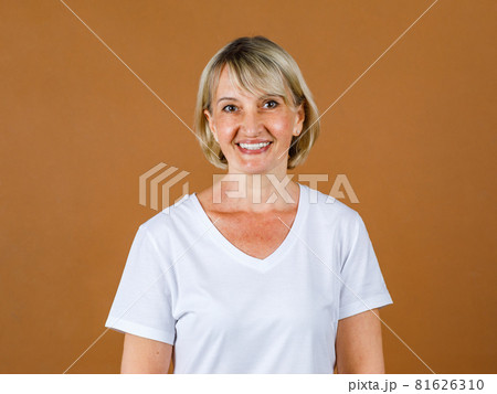 Portrait Close up studio mug shot of Caucasian senior happy confident blonde short hair female model wears clean white t-shirt standing smiling look at camera in front of brown wallpaper background