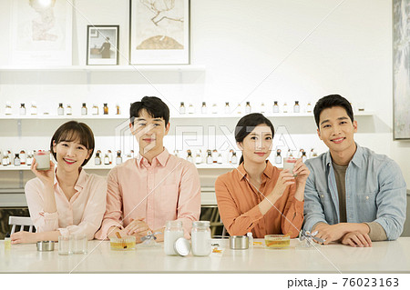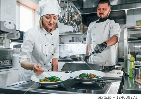 Woman and man are standing with blooming flower Chlorophytum on their work place in hothouse