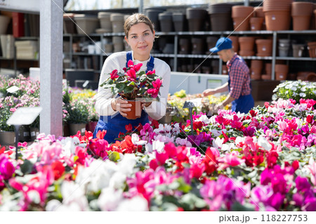 Gardening female worker in overall inspects young cyclamen plants after treatment with antifungal drugs. Care, supervision, fungicides
