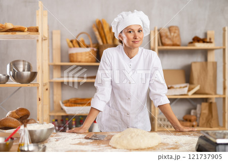 Portrait of successful young woman baker in apron smiling at camera posing during daily work in bakery