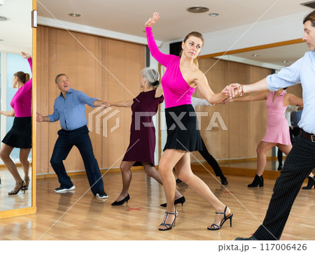 Young slim blonde is learning one-legged king pigeon pose from friendly experienced instructor during personal training in modern yoga studio. Individual practice with yoga guru concept.