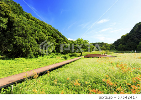 在初夏時分,橙色的花朵Nokanzo盛開在馬頭Kannon面前