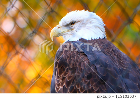 Profile portrait of an eagle. The combination of a powerful beak, a menacing look and beautiful plumage with a creative background around the eagle's head adds charm to the image.