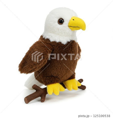 Plush bald eagle perched on a branch in a cozy indoor setting