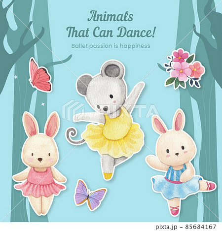Sticker template with Fairy ballerinas animals concept,watercolor style