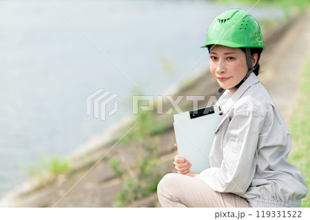 一名穿著工作服、戴著頭盔進行河流調查的婦女