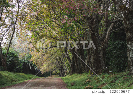 solo traveler in nature concept with country road with pink cherry blossom tree in springtime season