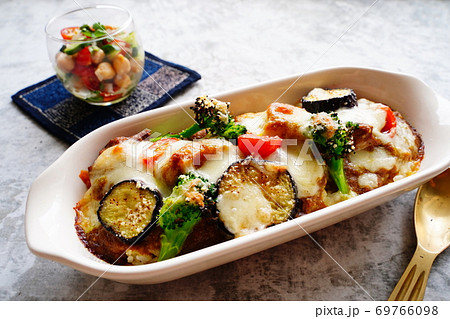 在白色背景上拍攝了一份烤咖哩,裡面有大量融化的奶酪和雞蛋