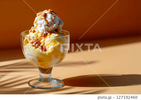 In golden hour light, industrial ice cream sundae on cream background, clean food photography style
