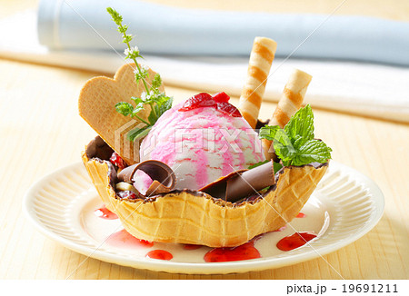 Delicious ice cream with chocolate. Healthy summer food concept.