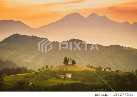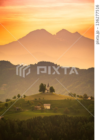 Sveti Tomaz, Slovenia. Church of Sveti Tomaz (Saint Thomas), Kamnik - Savinja Alps, beautiful colored sunrise sky.