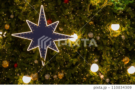 Christmas and New Year concept. Beautiful presents and decorations with bokeh lights background
