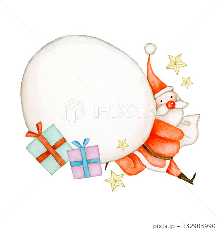 一個可愛、變形的聖誕老人走著,手裡拿著裝滿禮物的袋子